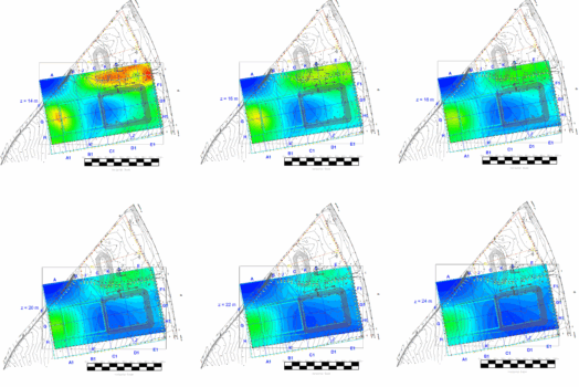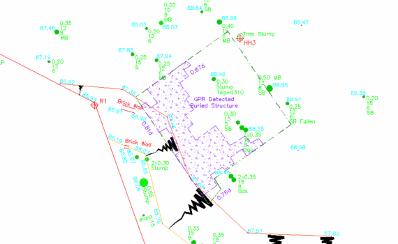 For developers planning extensive excavations, a buried building is something it’s best to know about before breaking ground. Alerted to the possible existence of a structure buried in the woods near Aldershot, we set to work using a specialist ground probing radar system, to see what we could find. What emerged was an extensive concrete WWII air raid shelter, completely submerged beneath the soil. We used a pulse radar with a low frequency antenna to give us a greater depth of penetration. Although this gives a lower resolution image, it’s the best method for surveying big structures, as higher frequencies can pick up too much detail and lack the required penetration depth. Using a grid of radar measurements, we were able to create individual cross-sections, which we could then manipulate using our ‘in-house’ GPRCAD software, before exporting into CAD and plotting as a plan outline.